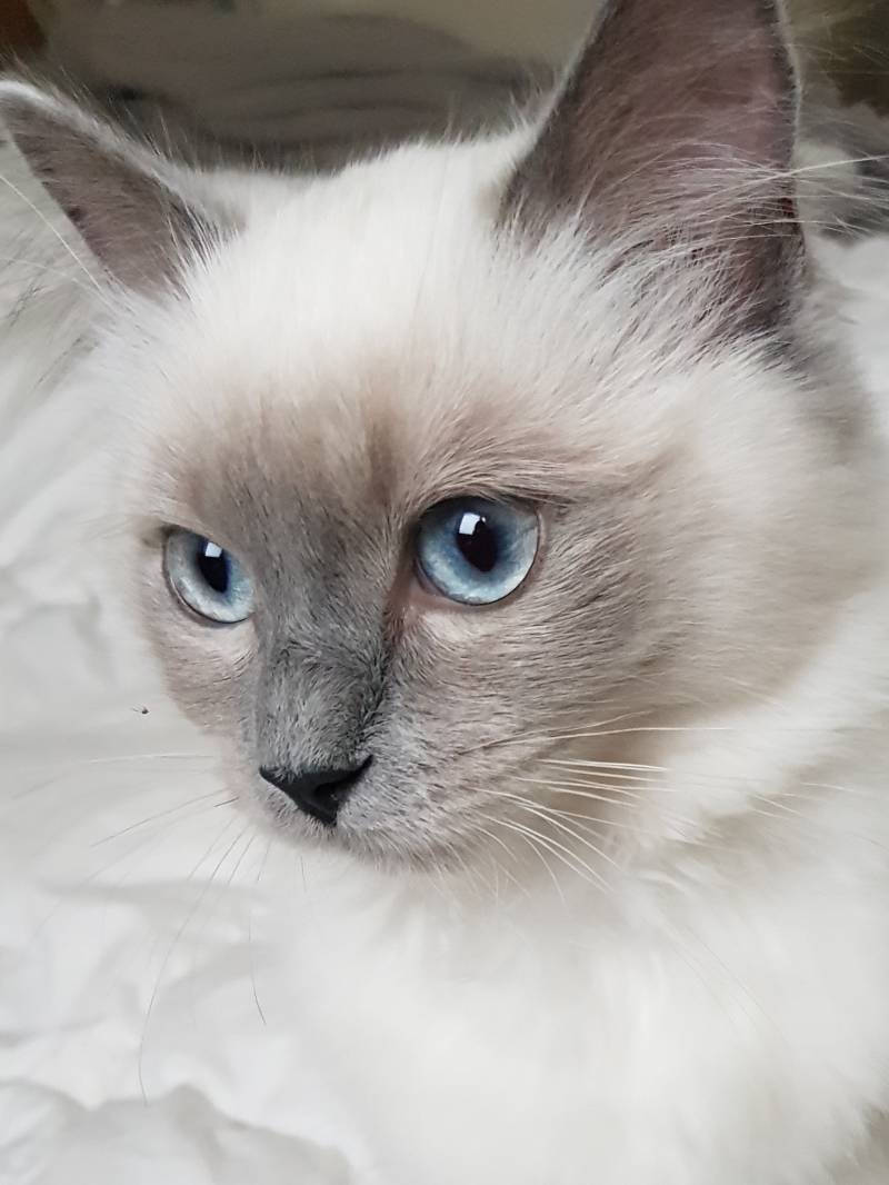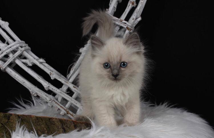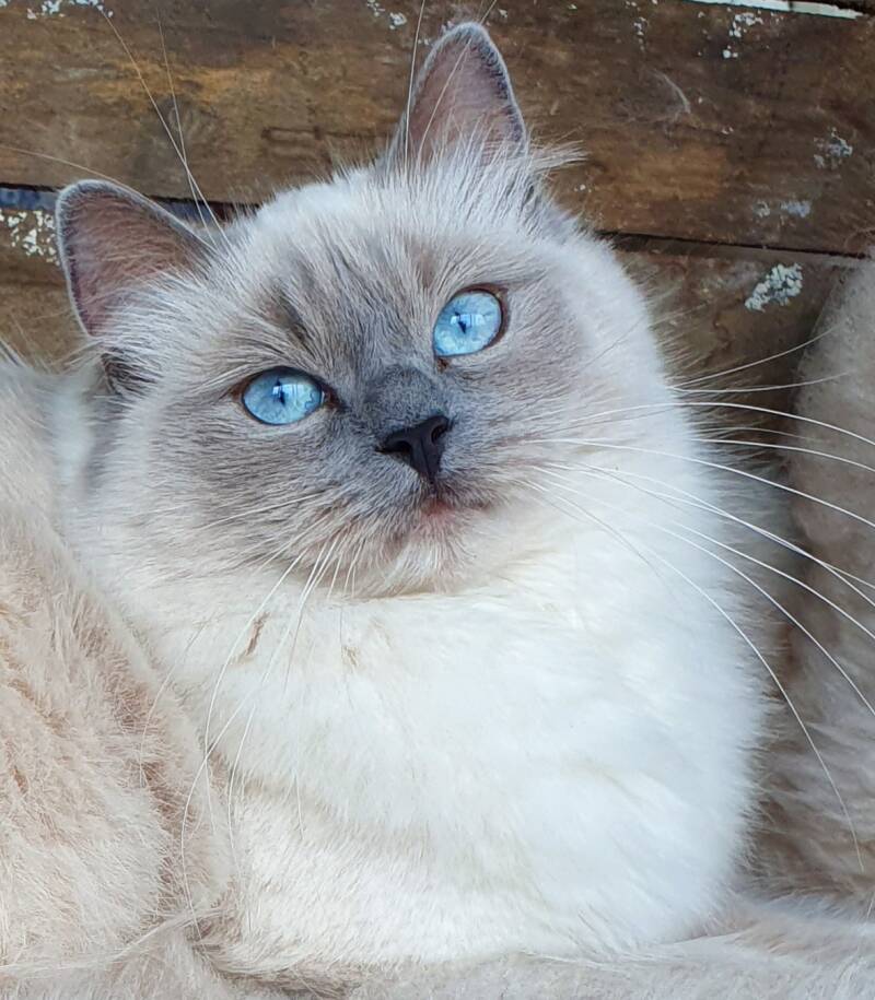 Mijn grote wens ging in vervulling. Jolie kwam bij ons wonen in oktober 2019, een mooi en lief Blue Point poesje uit een, voor mij, favoriete combi. Van karakter is ze natuurlijk speels, tegelijk ook gemoedelijk, rustig, en al zorgzaam, ze kan heerlijk genieten van haar te kriebelen.